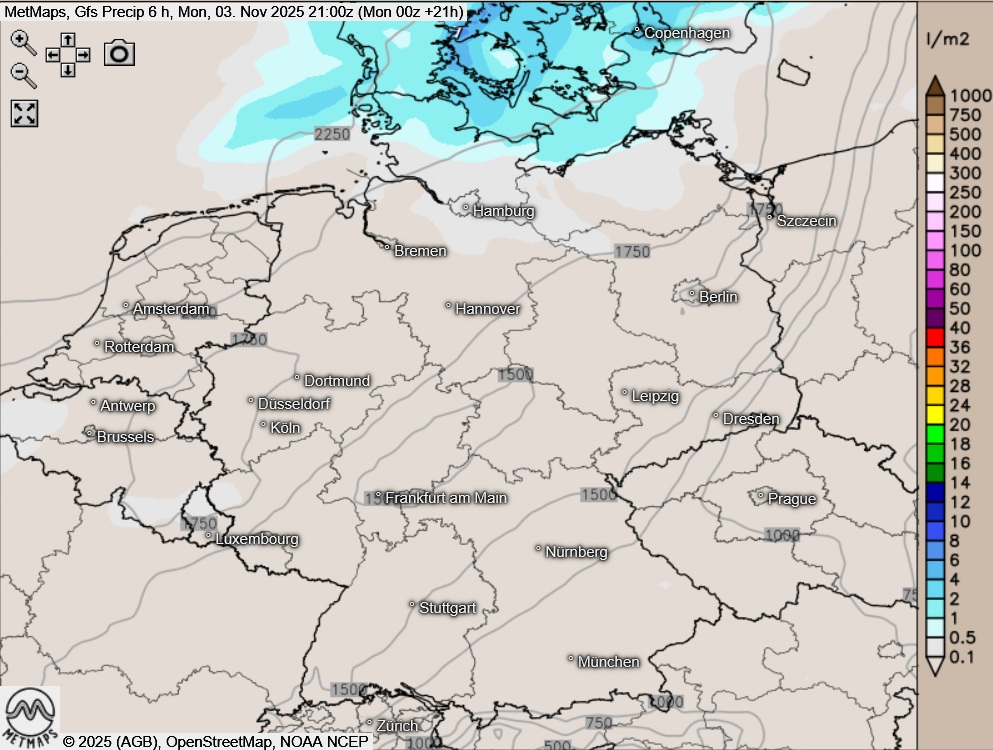 Die Wetter- / und Temperaturkarte für Montagnachmittag (15:00 Uhr) sowie die Sechs-Stunden-Regenmengen bis 21:00 Uhr nach GFS: