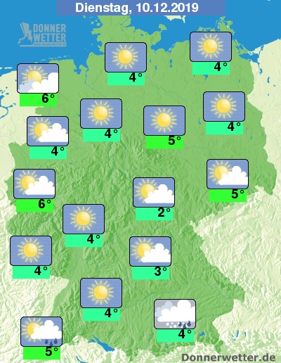 Am Dienstag halten sich vor allem am Alpenrand und im Südosten Deutschlands oft noch dichte Wolken, die hier gebietsweise Schnee, Schneeregen oder Regen bringen. Im übrigen Land ist es überwiegend heiter bis sonnig oder es ziehen aufgelockerte Wolken durch, dabei bleibt es trocken. Die Temperatur steigt auf 2 Grad im Vogtland und bis 6 Grad entlang des Rheins.