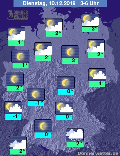 In der kommenden Nacht ziehen sich die dichten Wolken und die Schnee-, Schneeregen- und Regenfälle immer weiter in den Südosten Deutschlands zurück. Dahinter lockert und klart der Himmel verbreitet auf und es bleibt trocken. Die Temperatur sinkt auf 4 Grad in Emden und bis -1 Grad am Taunus. An den Küsten weht noch ein oft stürmischer Wind, dabei sind anfangs teils orkanartige Böen möglich.