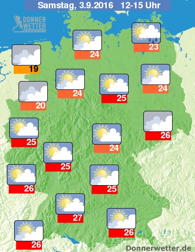 Heute Nachmittag ist es besonders über Norddeutschland häufig stark bewölkt, verbreitet heiter zeigt sich das Wetter hingegen über dem Süden. In den weiteren Landesteilen ist es überwiegend locker bis aufgelockert bewölkt, bis auf vereinzelte Schauer an der Ostsee bleibt es landesweit trocken. Die Temperatur steigt auf 19 Grad in Bremerhaven und bis 27 Grad in Stuttgart.