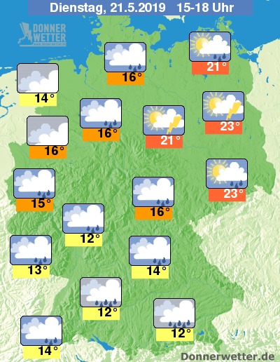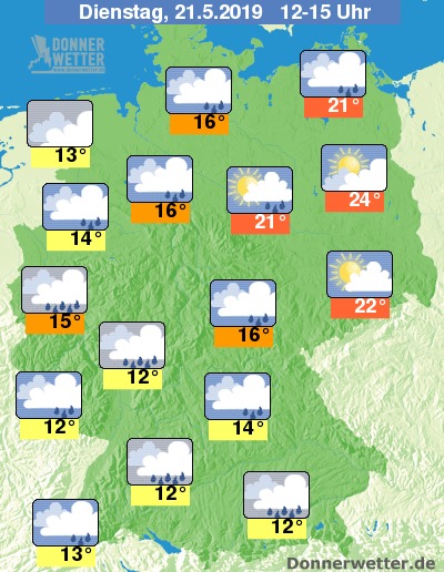 Am frühen Nachmittag gibt es zumindest in Sachsen und dem östlichen Brandenburg freundliche Abschnitte mit Sonnenschein. Sonst halten sich meistens kompakte Wolken mit zeitweiligem, teils kräftigem Regen oder Schauern und der Gefahr von lokalen Überschwemmungen. Ganz im Westen, sowie an der Ems treten Regenfälle nur selten auf.