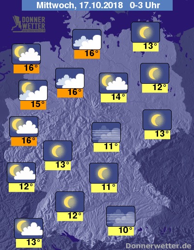 In der Nacht zeigt sich der Himmel in der Nordwesthälfte meist wechselnd oder stark bewölkt, entlang der Rheins überwiegen zunächst noch lockere Wolken. Im Nachtverlauf klart es hier dann aber auf, in den übrigen Landesteilen ist der Himmel abseits von örtlichen Nebelfeldern ebenfalls überwiegend sternenklar. Schauer sind in der Nacht nicht zu erwarten.