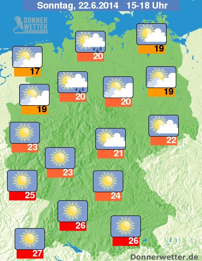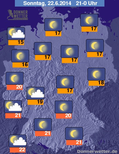 Am Abend ist es auch im Norden und Osten weitgehend locker bewölkt oder klar und es bleibt ebenfalls hier trocken. Dazu liegen die Abendwerte bei teils noch 22 Grad im Breisgau und bei etwa 15 Grad an der niederländischen Grenze.