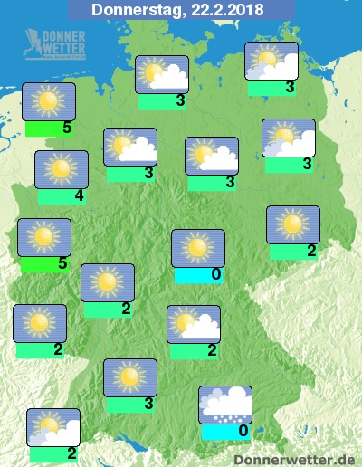 Ganz im Norden wechseln sich Sonne und wolkige Abschnitte miteinander ab. Vereinzelt treten Schnee- und Regenschauer auf. Im Alpenvorland hält sich meist eine dichte Wolkendecke, aus der es gelegentlich leicht schneien kann. Dazwischen strahlt verbreitet die Sonne von einem blauen Himmel. Die Höchsttemperaturen liegen allgemein zwischen 0 und 6 Grad. Im Süden bleibt es gebietsweise bei leichtem Dauerfrost. Der Nordost- bis Ostwind bläst spürbar und ist störend, weil er einem die Temperaturen noch wesentlich kälter empfinden lässt.