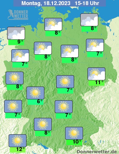 Am Montagnachmittag zeigt sich der Himmel über der Nord- und Osthälfte meist stark bewölkt oder es ist bedeckt, es bleibt aber meist niederschlagsfrei. In den südlichen Landesteilen ist es teils sonnig, teils kann sich aber auch noch hartnäckiger Nebel oder Hochnebel halten.