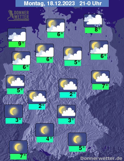In der Nacht auf Dienstag zeigt sich der Himmel über der Südhälfte nur leicht bewölkt oder es ist sternenklar, gebietsweise kann sich auch Nebel oder Hochnebel bilden. Im Norden ist es wechselnd oder stark bewölkt und vor allem im Umfeld der Küsten fällt zeitweise etwas Regen.