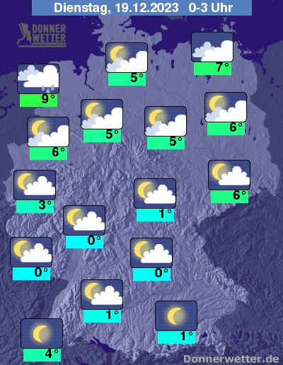 Die Temperaturen gehen in den frühen Morgenstunden zurück auf Werte um 9 Grad an der Nordseeküste und 0 Grad im Saarland.