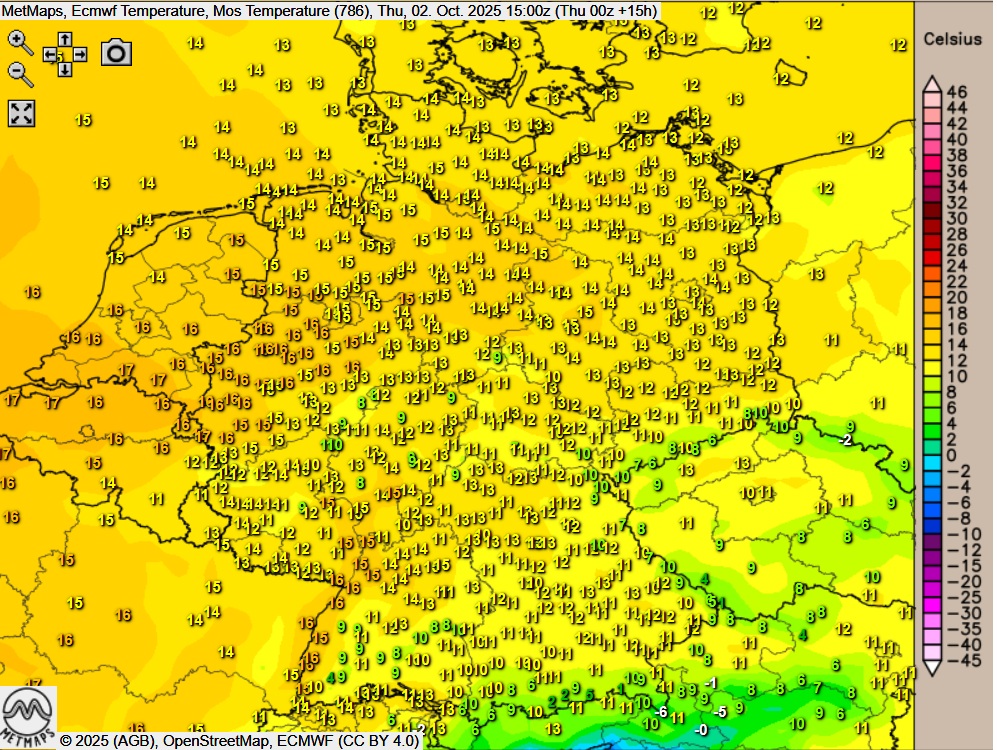 Die Temperatur- und Wetterkarte nach ECMWF für Freitagnachmittag (15:00 Uhr):