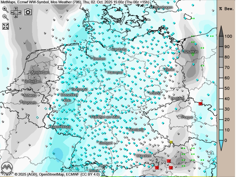 Am Donnerstagnachmittag zeigt sich der Himmel östliche der Elbe wechselnd bis stark bewölkt. In den übrigen Landesteilen ist es am Nachmittag heiter oder die Sonne scheint von einem wolkenlosen Himmel. Es bleibt trocken.
