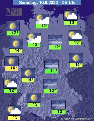 In der Nacht zum Samstag zeigt sich der Himmel über dem Land meist sternenklar. Einige, meist lockere Wolkenfelder sind vor allem im Norden, aber auch im Nordosten und Südwesten möglich, dazu bleibt es trocken. Die Temperatur sinkt auf 16 Grad in Bonn und 11 Grad in Jena.