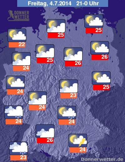 Heute Abend bilden sich vor allem im Süden Deutschlands weitere Schauer und Gewitter, auch sonst nimmt die Bewölkung von Südwesten her langsam weiter zu, dabei bleibt es in den übrigen Regionen allerdings weitgehend trocken. Die Abendtemperaturen liegen verbreitet bei sehr milden Werten zwischen 26 Grad in Karlsruhe und etwa 22 Grad in Emden.