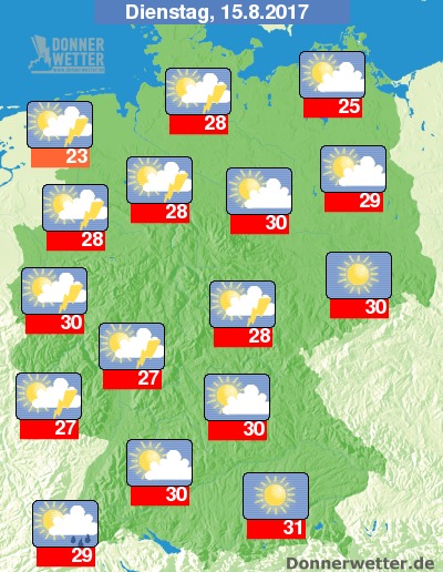 In Ost- und Süddeutschland gibt es nochmals ein freundlicher und sehr warmer bis heißer Sommertag mit reichlich Sonnenschein. Auch sonst scheint zunächst neben lockeren Wolken für längere Zeit die Sonne. Bei Temperaturen zwischen 25 und 32 Grad und zunehmender Schwüle, brauen sich am Nachmittag dunkle Gewitterwolken zusammen, die örtlich für Platzregen und Hagel sorgen können. Außerdem kann es zu stürmischen Böen kommen. An der Nordsee und auf den Bergen bleibt es etwas kühler. Die Schauer und Gewitter erreichen in der Nacht auch die östlichen Landesteile und Bayern.