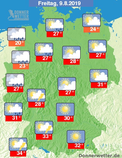Die Höchsttemperaturen liegen im Nordwesten nur zwischen 20 bis 25 Grad, sonst werden aber verbreitet wieder hochsommerliche Werte zwischen 26 und 33 Grad erreicht. Im Breisgau sind sogar nahe 35 Grad möglich.