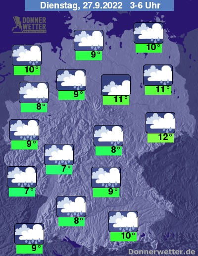 In der Nacht zum Dienstag bleibt es verbreitet bedeckt und es fällt immer wieder, teils auch kräftiger Regen. Die Temperatur sinkt auf 12 Grad in Dresden und bis 7 Grad in Wiesbaden.