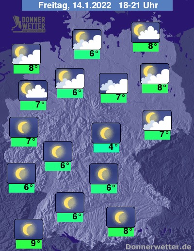 Heute Abend ist es über dem Norden des Landes meist wolkenverhangen, hier und ist es auch locker bis wechselnd bewölkt. Weiter nach Süden hin zeigt sich der Himmel jedoch sternenklar. Bei Werten von 4 Grad in Erfurt und etwa 9 Grad in Freiburg bleibt es überall trocken.