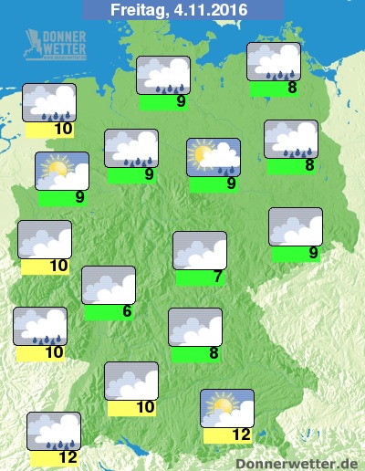 Der Einfluss der Tiefs über Nordeuropa nimmt am Freitag langsam zu und so müssen große Teile Norddeutschlands mit einem eher verregneten Start ins Wochenende rechnen. Auch im Rest des Landes ist es meist dicht bewölkt und die Sonne zeigt sich kaum einmal. Am Abend erreicht ein neues Regenband den Südwesten des Landes.