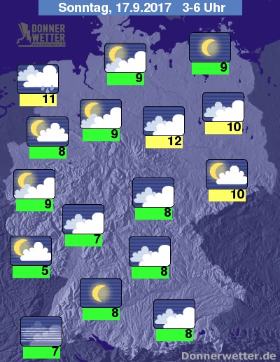 In der Nacht zum Sonntag klingen die Niederschläge im Süden immer weiter ab und über Baden-Württemberg klart der Himmel auch häufig auf. Einzelne Schauer bilden sich bei oft starker Bewölkung an der Nordsee, sonst ist es teils locker, teils stark bewölkt, aber weitgehend trocken. Die Temperatur sinkt auf etwa 12 Grad in Magdeburg und bis 5 Grad am Pfälzer Wald.