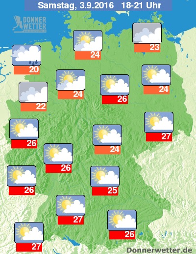 Heute Abend ziehen im Nordwesten dichte Wolken und nachfolgend zeitweiliger Regen auf. Im übrigen Norddeutschland ist es oft stark, teils auch aufgelockert bewölkt und dazu weitgehend trocken. Über der Südhälfte der Republik ist es überwiegend heiter, nur hier und da ziehen auch mehr Wolken durch, dabei bleibt es trocken. Die Temperatur liegt bei 20 Grad in Ostfriesland und bis 27 Grad in Freiburg.