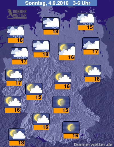 In der Nacht zum Sonntag bleibt der Himmel nach Südosten hin noch meist leicht bewölkt oder sternenklar. Im Nordwesten fällt bereits zu Beginn aus dichten Wolken immer wieder, teils auch langanhaltender Regen. Im Laufe der Nacht und bis zum Morgen breiten sich die Regenwolken bis etwa über die Nordwesthälfte Deutschlands hin aus, weiter nach Südosten bleibt es hingegen trocken. Die Temperatur sinkt auf 18 Grad in Hannover und bis 15 Grad in Oberfranken.