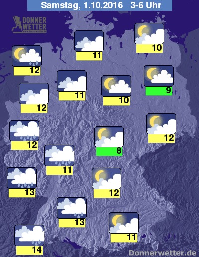In der Nacht zum Samstag ziehen aus Südwesten dichte Wolken auf, die zuerst nur im Südwesten, bis zum Morgen hin auch im Westen bis in die Landesmitte hinein zum Teil kräftigen Regen bringen. An der Nordsee sind bei starker Bewölkung einzelne Schauer möglich, sonst ist es über dem Land verbreitet stark bis aufgelockert bewölkt und dazu trocken. Die Temperatur sinkt auf 14 Grad in Freiburg und etwa 8 Grad im Eichsfeld.