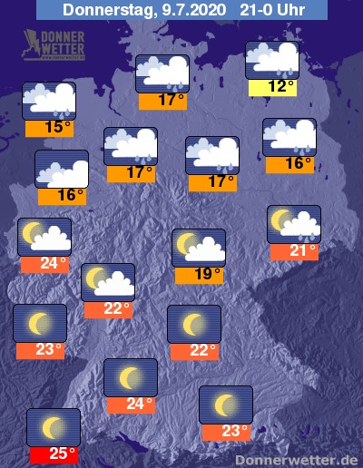 Am frühen Abend liegen die Temperaturen im Norden nur zwischen 15 und 21 Grad, in der Mitte zwischen 22 und 27 Grad und ganz im Süden und Südwesten zwischen 27 und 31 Grad.