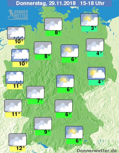 Die Temperaturen liegen in der Osthälfte zwischen 3 und 6 Grad, in der Westhälte schon bei milderen 6 bis 11 Grad.