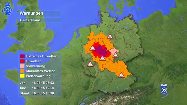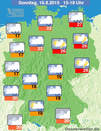 Am Sonntagnachmittag regnet es in der Republik verbreitet. Bei Höchsttemperaturen um 16 Grad C am Main und um 28 Grad in Dresden sind nur selten Auflockerungen zu erwarten. In der Osthälfte besteht zudem weiterhin ein erhöhtes Gewitterrisiko. Allerdings ist es hier auch heiss und zum Teil auch sonnig.