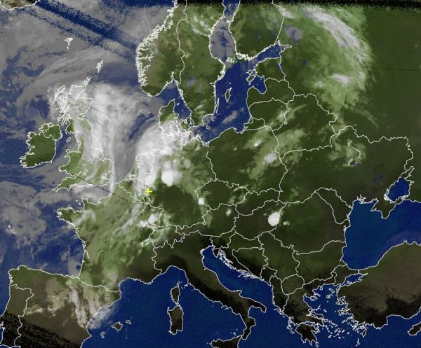 Auf dem Satellitenbild von heute Morgen erkennen wir verbreitet dichte Wolken von den Britischen Inseln bis nach Mitteleuropa hinein. Hierbei fiel besonders über Benelux und über der Nordwesthälfte Deutschlands vielerorts kräftiger und teils ergiebiger Regen. Die besonders hellweißen und kreisrunden Gebilde deutet auf einzelne Gewitterzellen hin. Eine solcher Gewittercluster zog in den Morgenstunden über Westdeutschland hinweg und brachte dort zum Teil schwere Gewitter.