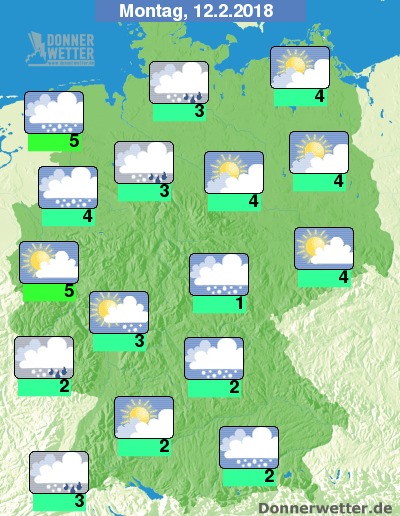 Zum Start in die Woche ziehen oft noch einige und dabei auch dichte Wolken durch, die bevorzugt im Norden und Süden, jedoch auch in der Landesmitte Schneeschauer bringen, teils ist auch Schneeregen möglich. Im Tagesverlauf kann sich jedoch vor allem im Westen, jedoch ebenfalls im Osten die Sonne besser durchsetzen, dazu bleibt es dann meist trocken. Es werden 1 bis 5 Grad erreicht.