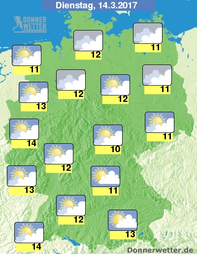Am Dienstag ist es im Norden und Osten häufig stark, zum Teil aber auch aufgelockert bewölkt. Im übrigen Bundesgebiet ist es hingegen überwiegend nur locker bis aufgelockert bewölkt, teils sogar sonnig, dabei bleibt es landesweit trocken. Die Temperatur steigt auf 10 Grad im Eichsfeld und bis 14 Grad im Breisgau.