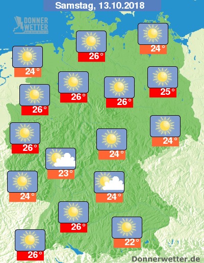 Heute halten sich hier und da noch einzelne Nebelfelder, abgesehen davon ist es über dem Land jedoch verbreitet sonnig und es bleibt überall trocken. Die Temperatur erreicht spätsommerliche 23 Grad am Westerwald und bis 26 Grad in der Norddeutschen Tiefebene.