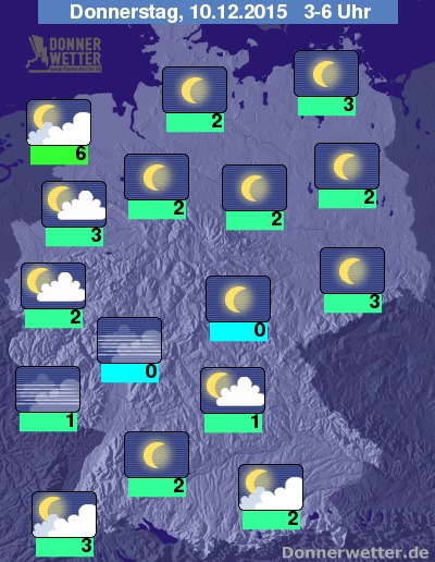 In der kommenden Nacht ist es über Bayern und Sachsen anfangs meist stark bewölkt, dabei bleibt es aber schon überwiegend trocken, bis zum Morgen klart der Himmel dann auf. Im übrigen Bundesgebiet ist es dagegen zunächst verbreitet sternenklar, in der zweiten Nachthälfte ziehen im Norden und Westen jedoch auch einige, meist lockere Wolken auf, dazu bleibt es aber trocken. Die Temperatur sinkt auf 6 Grad an der Nordsee und bis 0 Grad am Spessart. Stellenweise bildet sich Nebel oder Hochnebel, dabei ist teils Rauhreif möglich.