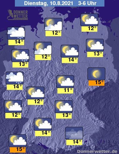 In der kommenden Nacht zeigt sich der Himmel überwiegend locker bewölkt, nicht selten ist es auch sternenklar. Besonders im Norden und Westen ziehen jedoch auch vielerorts dichte Wolken durch, dazu bleibt es zunächst weitgehend trocken. Gegen Morgen setzt jedoch im Westen verbreitet Regen ein. Die Temperatur sinkt auf 15 Grad in Freiburg und bis 11 Grad in Jena.