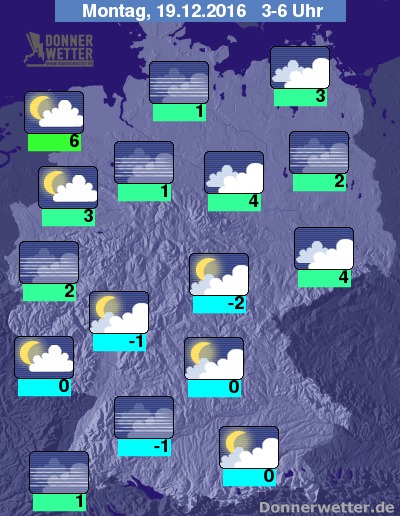 Am Montag bleibt die Wolkendecke vom Nordosten bis in den Osten meist verschlossen, dabei fällt im Osten anfangs noch gebietsweise Regen, sonst bleibt es trocken. In den anderen Landesteilen ist es teils locker, teils aufgelockert, anfangs auch noch stark bewölkt, jedoch trocken. Von Südwesten her setzt sich im Tagesverlauf sonniges Wetter durch. Die Temperatur steigt auf 3 bis 7 Grad.