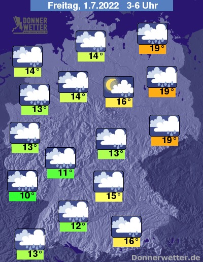 In der Nacht zum Freitag ist es anfangs noch teils aufgelockert bewölkt und oft noch trocken, jedoch ziehen von Westen her kompakte Wolken durch und es bilden sich verbreitet Schauer und teils kräftige Gewitter. Die Temperatur sinkt auf sehr milde 19 Grad in Berlin und auf etwa 10 Grad im Saargau.