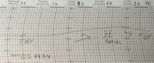 Wie aus dem Lehrbuch repräsentiert der Luftdruckverlauf das Wettergeschehen der vergangenen Woche. Gut zu erkennen ist das Tief, das zur Mitte der vergangenen Woche weiten Teile Deutschlands große Regenmengen bescherte. Zum Wochenende hin stieg der Luftdruck dann wieder, bevor am Sonntag erste Vorboten einer Kaltfront das Land erreichten.