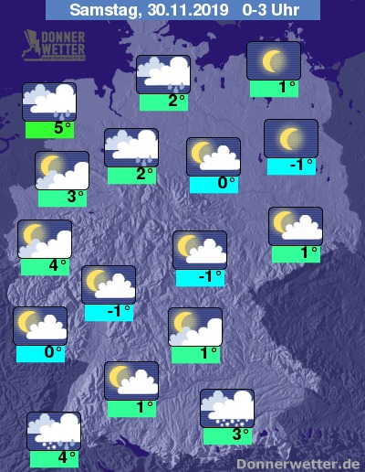 In der Nacht zeigt sich der Himmel über dem Land wechselnd bewölkt. Im Nordwesten sowie im Süden dominieren meist dichte Wolken, aus denen zeitweise Schauer fallen können, an den Alpen sowie im Schwarzwald auch als Schneeregen oder Schnee. In den übrigen Landesteilen überwiegt lockere oder aufgelockerte Bewölkung und es bleibt meist trocken, im äußersten Nordosten klart der Himmel auch auf.