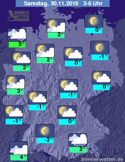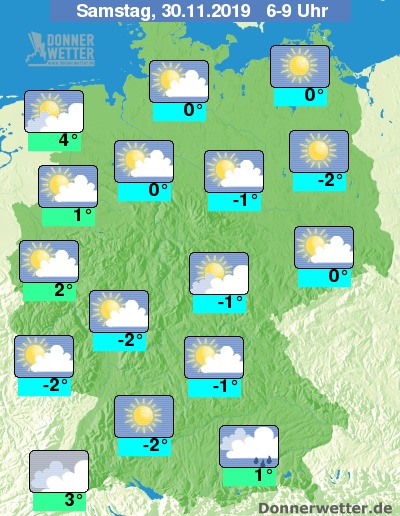 Die Temperaturen erreichen in den Frühstunden Werte um -2 Grad im Pfälzer Bergland und um 4 Grad an der Nordseeküste.