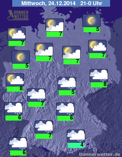 In der Nacht auf den 1. Weihnachtsfeiertag beschränken sich die dichten Regenwolken auf die Südhälfte des Landes, sie ziehen bis zum Morgen noch ein Stück weiter nach Süden, so dass es morgens auch in der Mitte Deutschlands nachfolgend trocken bleibt. In der Nordhälfte der Republik bleibt es in der Nacht dagegen meist leicht bewölkt oder auch sternenklar, dazu bleibt es mit Ausnahme des Nordseeumfeld auch trocken. An den Küsten weht starker und teils stürmischer Wind. Die Temperatur sinkt auf 6 Grad in Stuttgart und etwa 1 Grad im Vogtland.