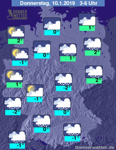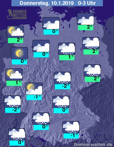 In der Nacht zeigt sich der Himmel über der Nordwesthälfte meist locker oder aufgelockert bewölkt, regional kann es auch mal aufklaren, und es bleibt meist trocken. In den übrigen Landesteilen bleibt der Himmel überwiegend bedeckt, in der gesamten Süd- und Osthälfte muss die ganze Nacht über zudem mit teils starken Schneefällen gerechnet werden.