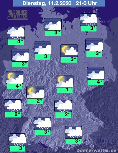 Die Temperaturen liegen am Abend bei Werten um 4 bis 6 Grad und sinken im weiteren Verlauf auf 4 bis 1 Grad ab.