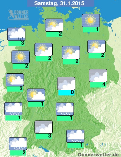 Am Samstag ist es häufig stark, vor allem im Norden, aber gebietsweise auch in den anderen Landesteilen wechselnd bewölkt, regional auch sonnig. In der Südhälfte der Republik fällt zeitweilig Schnee, sonst fällt meist nur hier und da etwas Schnee und die meiste Zeit bleibt es trocken. Die Temperatur steigt auf 0 Grad am Elstergebirge und bis 4 Grad in Dresden.