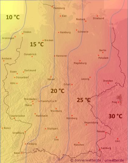 Die Temperaturen sinken auf Werte um 24 Grad C in Dresden und um 16 Grad C im Emsland.