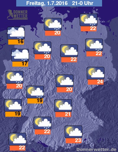Am Freitagabend sind vor allem in der Nordhälfte phasenweise Schauer zu erwarten, entlang der Oder sind zudem Gewitter möglich. Sonne und Wolken gibt es dabei im Wechsel, nur zwischen Ostfries- und Münsterland zeigt sich der Himmel über weite Strecken bedeckt.