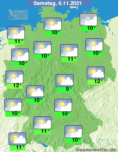 Am Samstag zeigt sich die Südhälfte des Landes häufig heiter bis sonnig, sonst ist es aber meist stark bewölkt oder trüb, hier und da können sich aber auch Auflockerungen zeigen. An den Küsten bilden sich einzelne Schauer, sonst bleibt es trocken. Die Temperatur steigt auf 9 Grad in Erfurt und bis 12 Grad in Köln.