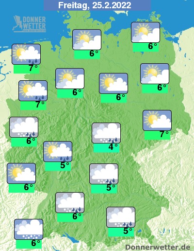 Am Freitag zeigen sich zum Teil Aufheiterungen, oft ziehen aber auch dichte Wolken durch, dabei bilden sich einzelne Schnee-, Schneeregen-, Regen- oder Graupelschauer. Die Temperatur steigt auf 4 Grad im Grabfeld und bis 7 Grad an der Ems. An der Nordsee weht ein oft stürmischer Wind.
