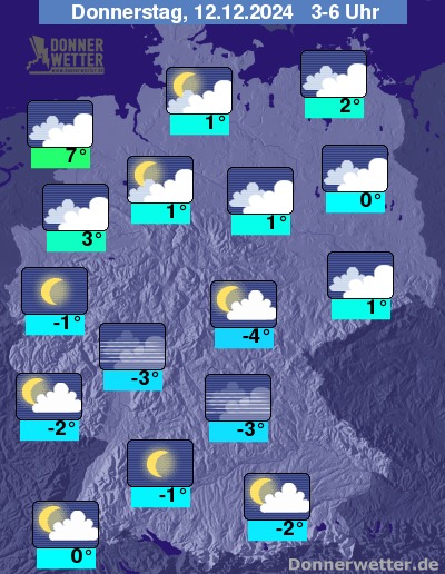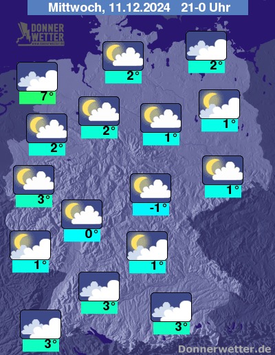 In der Nacht zum Donnerstag bleibt der Himmel meist bedeckt, größere Wolkenlücken zeigen sich vor allem im Umfeld der Mittelgebirge. In der Nordhälfte kann lokal etwas Sprühregen fallen, in den übrigen Landesteilen bleibt es weitgehend trocken.