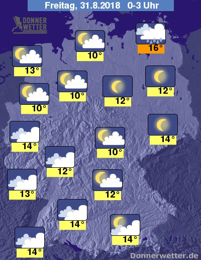 In der Nacht klingen die letzten Schauer schon früh ab und vor allem im Norden und Osten des Landes ist der Himmel bis in die Morgenstunden meist nur leicht bewölkt oder mitunter sogar wolkenlos. Nur an der Ostseeküste und auf den vorgelagerten Inseln ist noch mit einzelnen Schauern zu rechnen. Währenddessen nimmt die Bewölkung im Verlauf der Nacht von Südwesten her zu und der Himmel ist dort am frühen Morgen meist bedeckt.