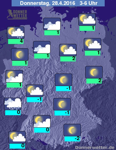 In der Nacht zum Donnerstag klart der Himmel über der Bundesrepublik über weiten Teilen auf. Oft starke Bewölkung hält sich jedoch im Südwesten, sowie im Norden und im Nordseeumfeld, hier sind jeweils einzelne Schauer möglich. Im großen Rest des Landes bleibt es jedoch trocken. Die Temperatur sinkt auf 4 Grad in Bremerhaven und bis -2 Grad in Augsburg.