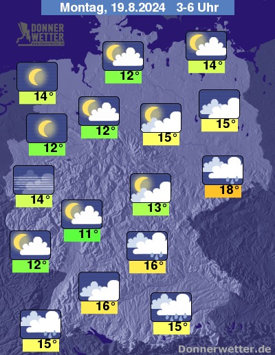 In der Nacht zum Montag fällt im Süden und Osten bei starker Bewölkung noch gebietsweise Regen, auch einzelne Gewitter sind möglich. In den übrigen Landesteilen ist es sternenklar oder nur gering bewölkt und es bleibt meist trocken.